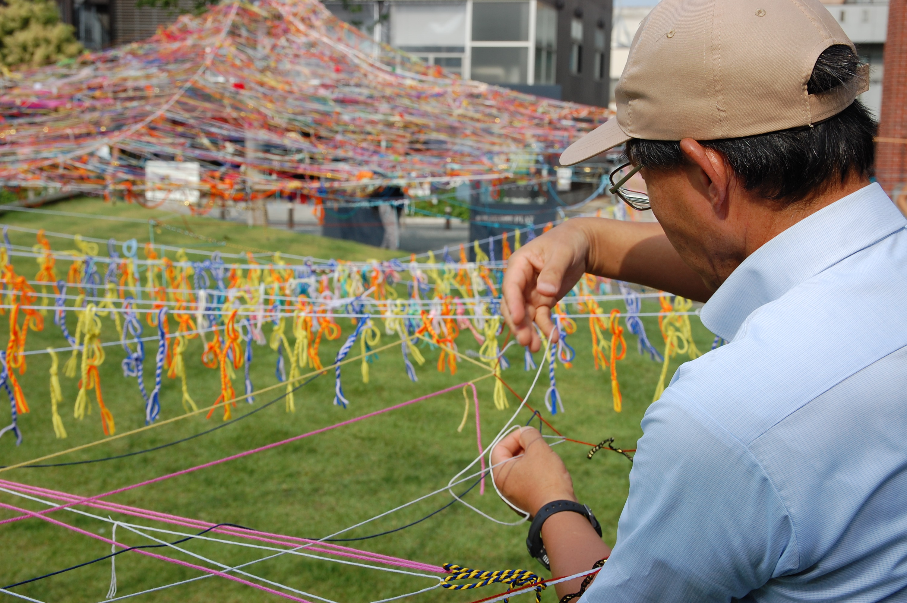 PLAT前のほか、名古屋市美術館前や、岡崎の籠田公園で展開されている参加型作品。様々な素材と色の紐が結びつけられていくプロジェクトで、会期終了の1週間前からは、3つの作品が愛知芸術文化センターに結集する予定です。